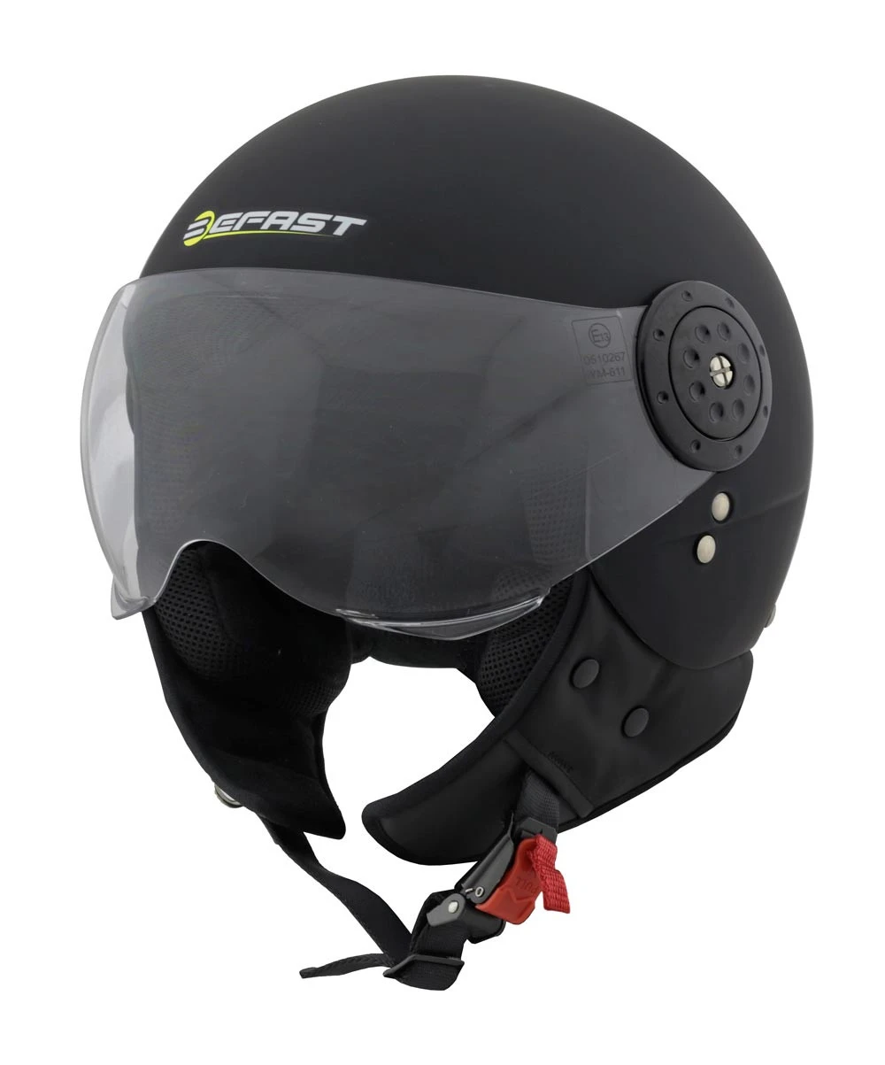 Il Town di Befast è il pratico jet che completa la linea di caschi jet e demi-jet offerti da Befast. Compatto, ergonomico ed estremamente leggero, il Casco Town è la scelta ideale per chi vuole un casco capace di offrirti sempre il giusto comfort alla guida della tua motocicletta, senza rinunciare ad avere sempre un look sobrio e spiccatamente cittadino. La visiera con taglio ad occhiale, dona quel tocco in più ad un casco già di per sé estremamente moderno e giovanile; il casco dispone inoltre di soffici e confortevoli interni e di sistema di chiusura con fibbia micrometrica.