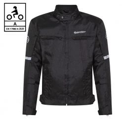 E’ una giacca Certificata in grado cioè di soddisfare i requisiti imposti dalla normativa EN 17092-4:2020 che regola i DPI (dispositivi di protezione personale) e prevede una serie di parametri di resistenza agli urti, allo strappo e all’abrasione atti a valutare il grado di sicurezza di un capo. La Giacca ALL TIME non solo rispetta gli standard di sicurezza conformi alla normativa sopracitata di livello A, ma dispone anche di protezioni CE Certificate EN 1621-1:2012 di Livello 2 su spalle e gomiti e predisposizione per l’inserimento di un paraschiena certificato da acquistare separatamente.