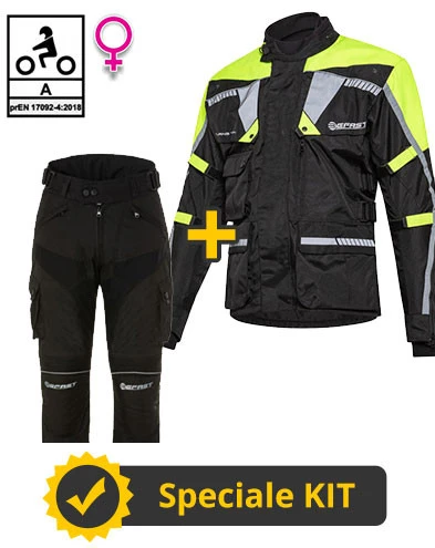 Descrizione prodotto Kit completo Touring Tech Lady CE 3 strati Giallo – Giacca moto donna certificata Befast + Pantaloni moto donna certificati Befast