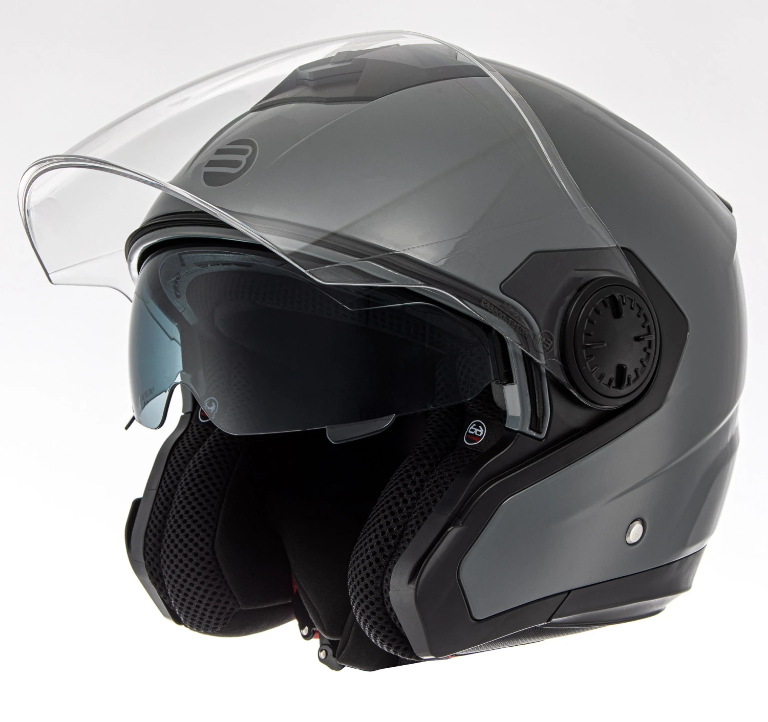 Con doppia visiera, una trasparente realizzata in policarbonato, e un occhialino parasole interno fumè azionabile tramite meccanismo indipendente.