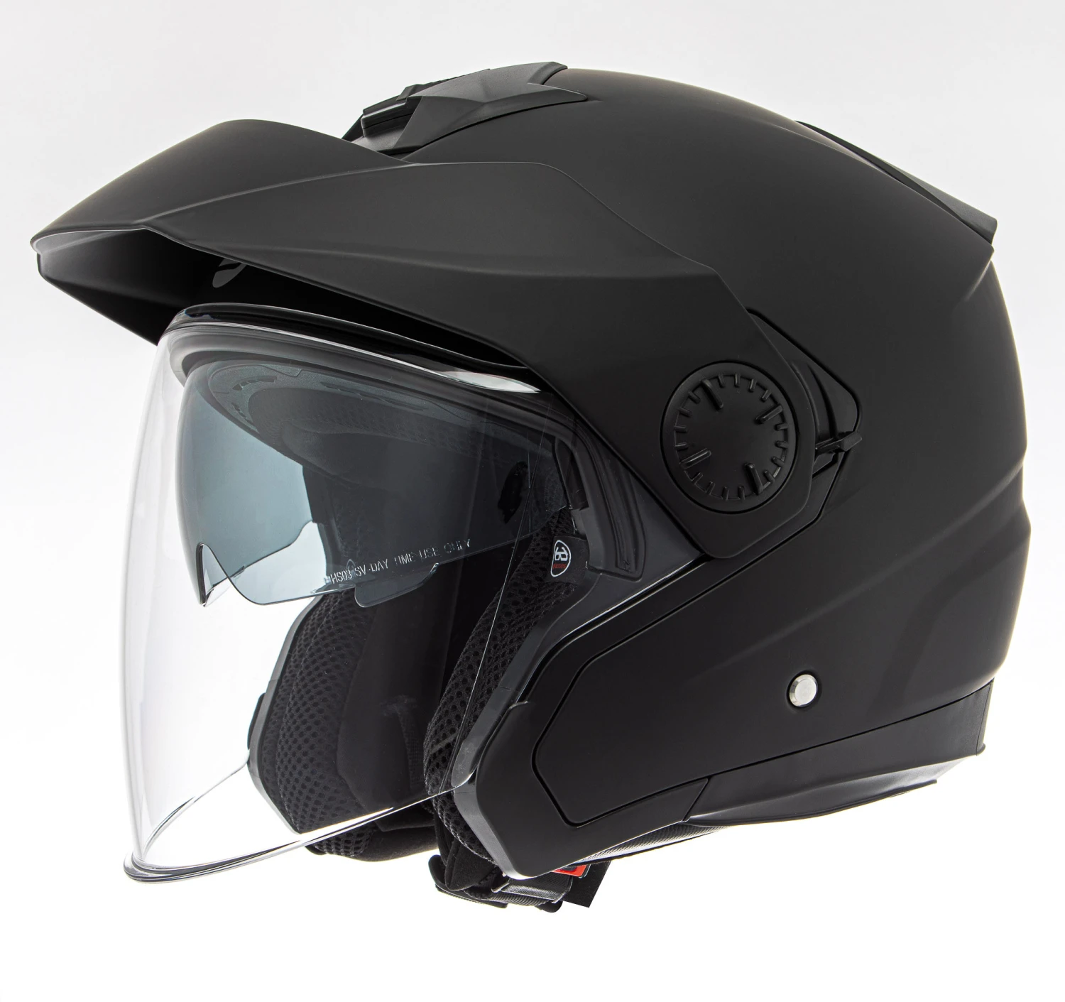 Con doppia visiera, una trasparente realizzata in policarbonato, e un occhialino parasole interno fumè azionabile tramite meccanismo indipendente.