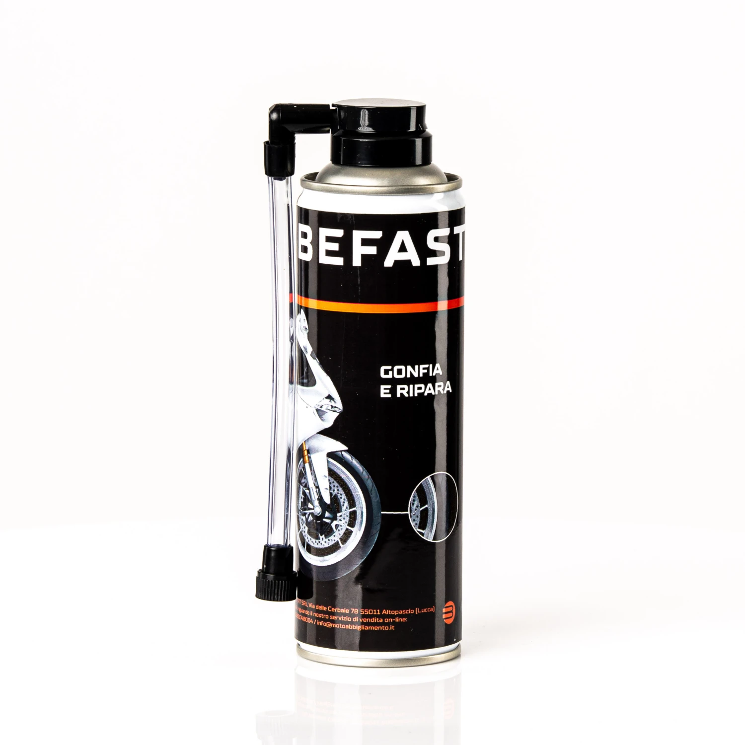 Il Gonfia e Ripara di Befast è pronto all’uso e vi permetterà di ripartire in pochi istanti in caso di foratura, Viaggiate in moto senza pensieri con il Gonfia e Ripara di Befast che grazie al suo semplice utilizzo vi permetterà di riparare il vostro pneumatico in un batter d’occhio!