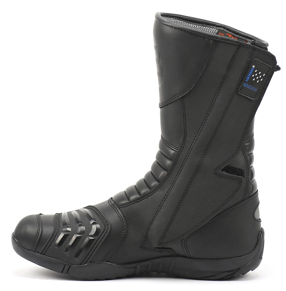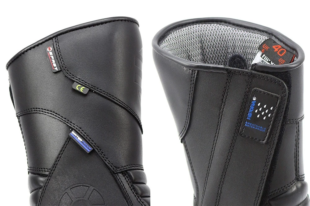 La tomaia in pelle con inserto interno in PU assicura robustezza e resistenza, mentre la fodera interna in materiale mesh per una migliore traspirazione e la speciale membrana Hypora 100% waterproof offrono il massimo grado di confort alla guida.